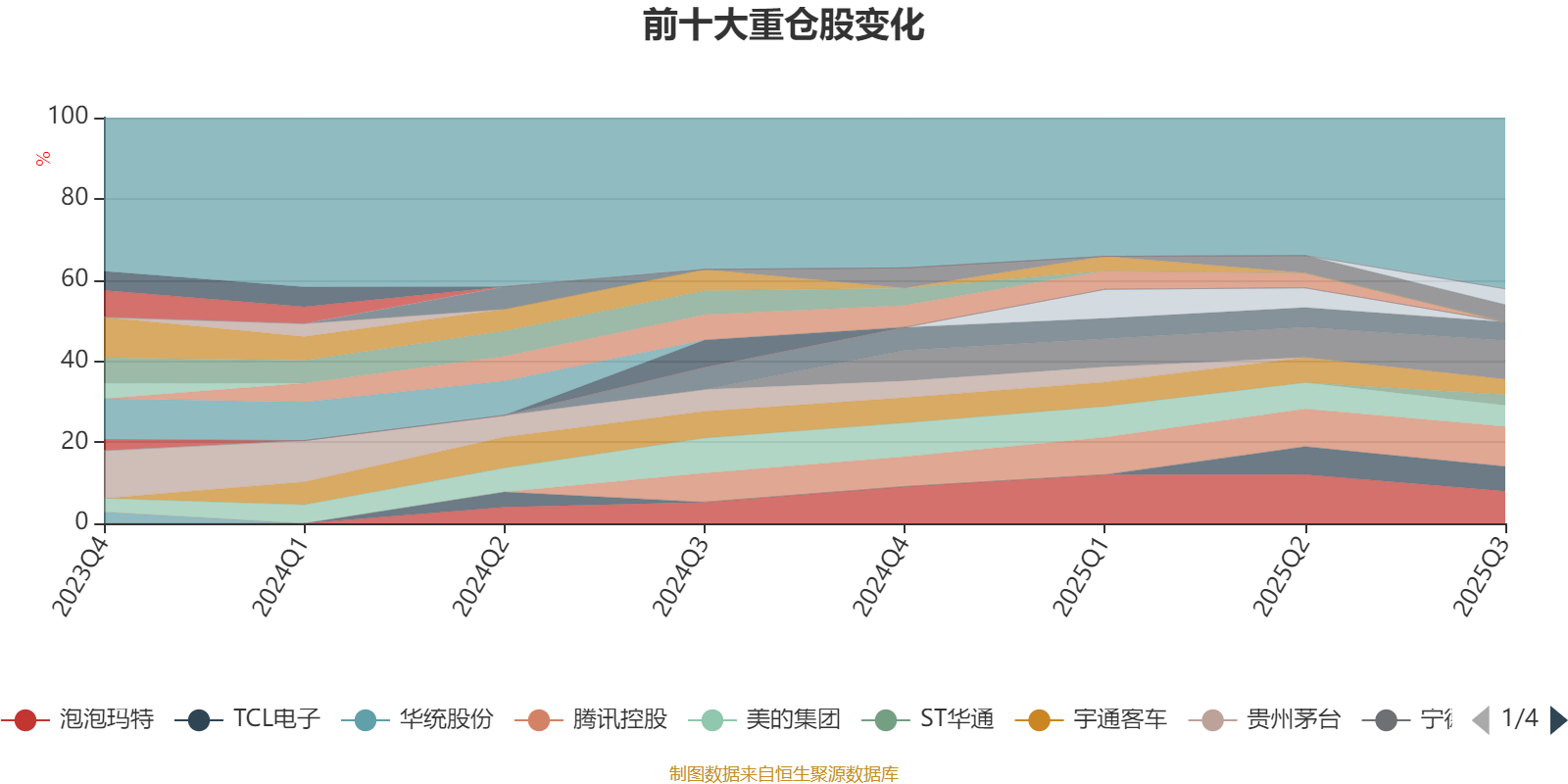 该基金持股集中度较高。截至2025年三季度末,基金十大重仓股分别是腾讯控股、宁德时代、泡泡玛特、TCL电子、美的集团、福耀玻璃、吉利汽车、快手-W、宇通客车、ST华通。