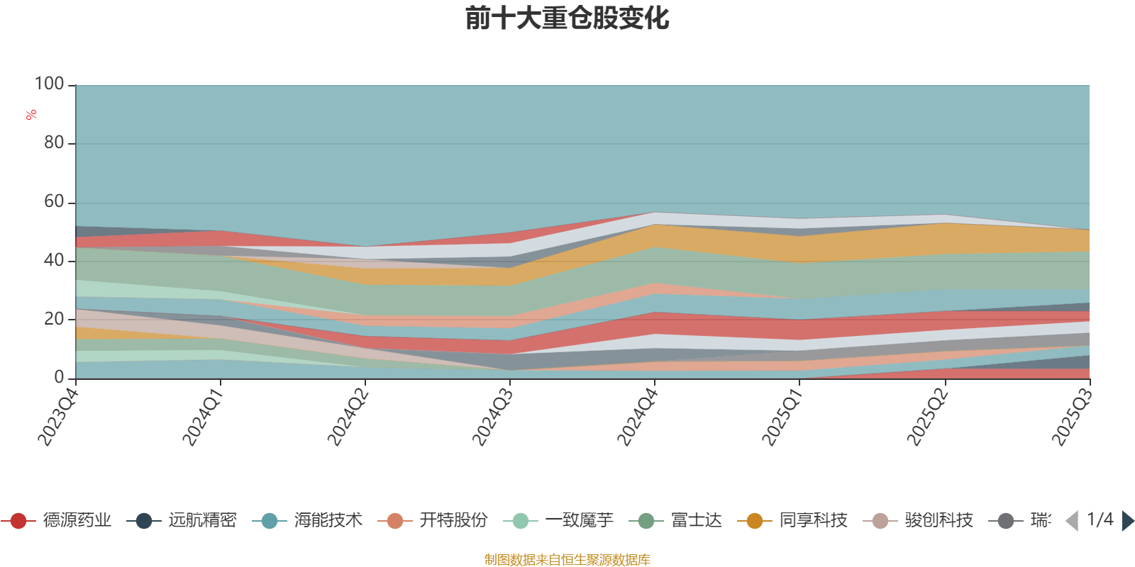 截至2025年三季度末,基金十大重仓股分别是贝特瑞、锦波生物、远航精密、同力股份、瑞华技术、纳科诺尔、康比特、海能技术、德源药业、连城数控。