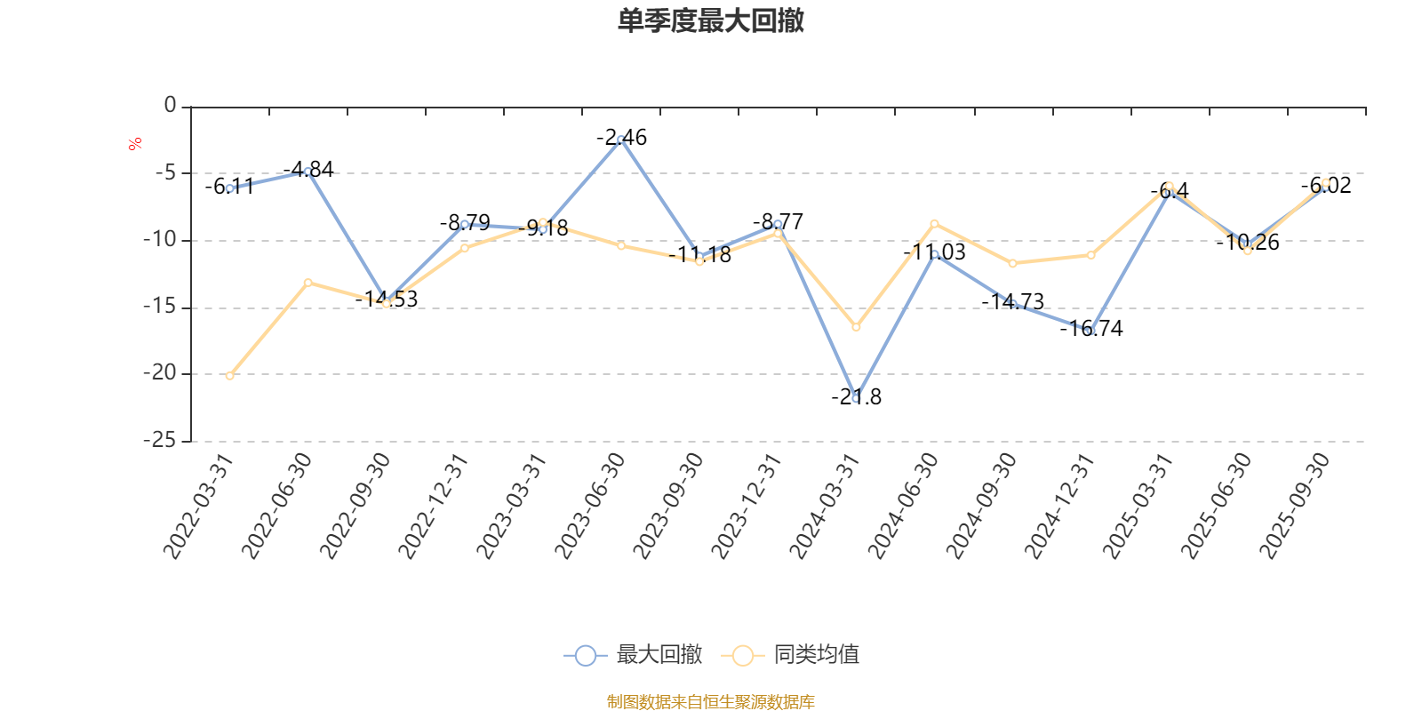截至10月29日,基金近三年最大回撤为30.72%,同类可比基金排名144/513。单季度最大回撤出现在2024年一季度,为21.8%。
