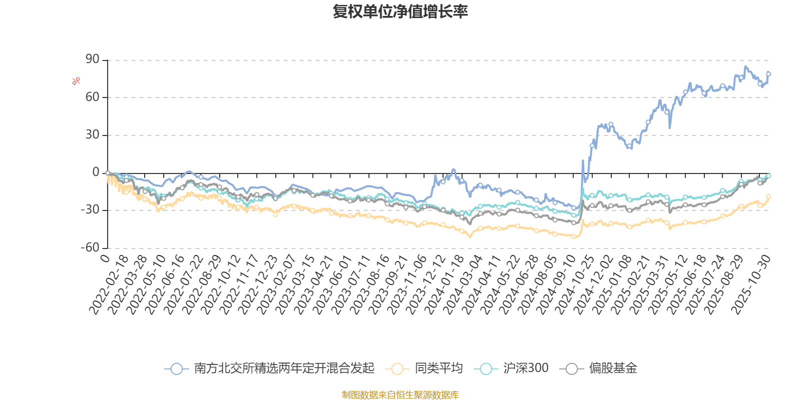 截至10月30日,南方北交所精选两年定开混合发起近三个月复权单位净值增长率为6.27%,位于同类可比基金496/621;近半年复权单位净值增长率为13.12%,位于同类可比基金546/621;近一年复权单位净值增长率为42.36%,位于同类可比基金169/611;近三年复权单位净值增长率为114.01%,位于同类可比基金6/518。