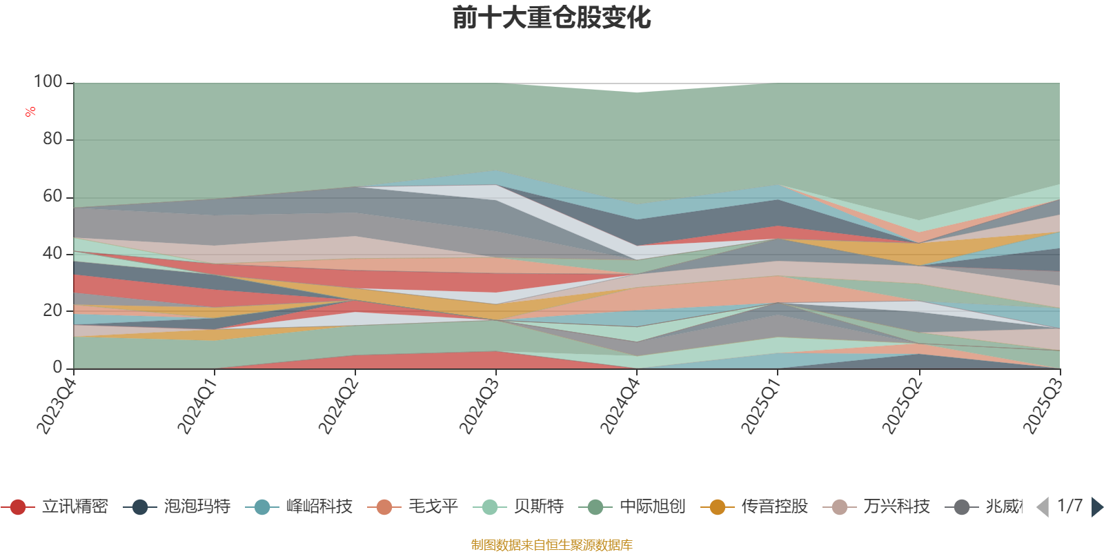 该基金持股集中度较高。截至2025年三季度末,基金十大重仓股分别是浙江荣泰、恺英网络、厦钨新能、寒武纪、中际旭创、工业富联、先导智能、永鼎股份、新易盛、银轮股份。