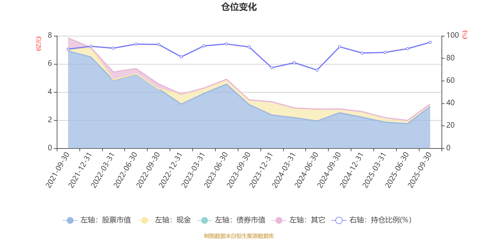 据定期报告数据统计,近三年平均股票仓位为84.65%,同类平均为85.66%。2025年三季度末基金达到94.27%的最高仓位,2024年上半年末最低,为69.61%。