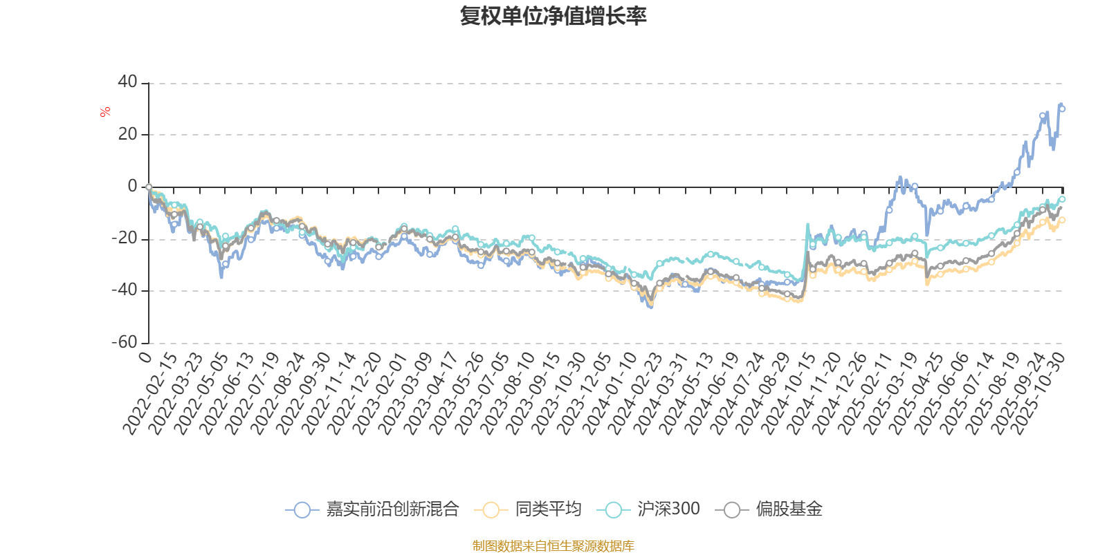 截至10月30日,嘉实前沿创新混合近三个月复权单位净值增长率为30.17%,位于同类可比基金20/185;近半年复权单位净值增长率为40.62%,位于同类可比基金44/185;近一年复权单位净值增长率为65.81%,位于同类可比基金9/181;近三年复权单位净值增长率为90.72%,位于同类可比基金6/175。