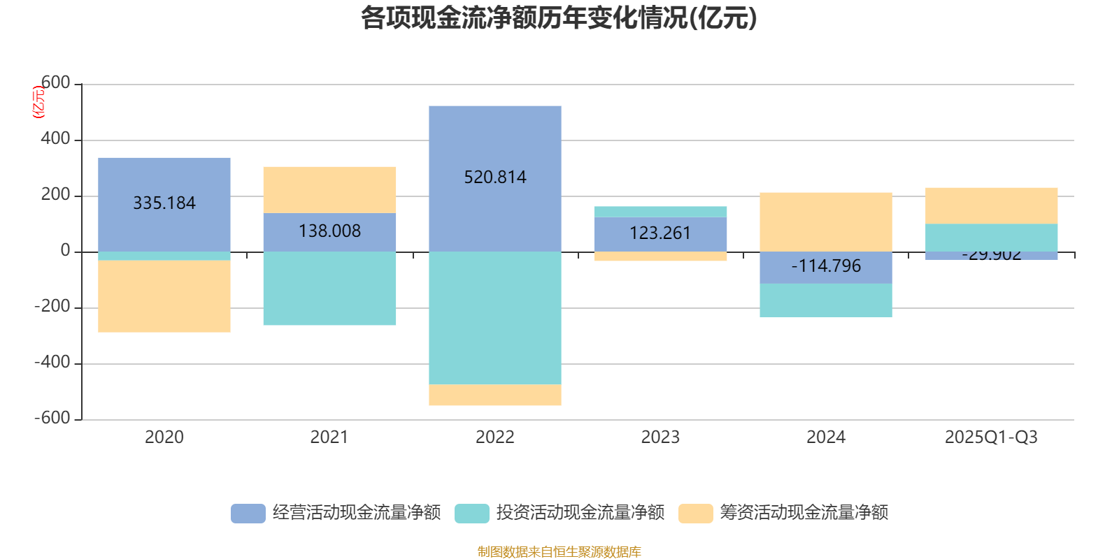 2025年前三季度,公司经营活动现金流净额为-29.9亿元,同比增加28.71亿元;筹资活动现金流净额128.62亿元,同比增加117.29亿元;投资活动现金流净额99.57亿元,上年同期为-7.45亿元。