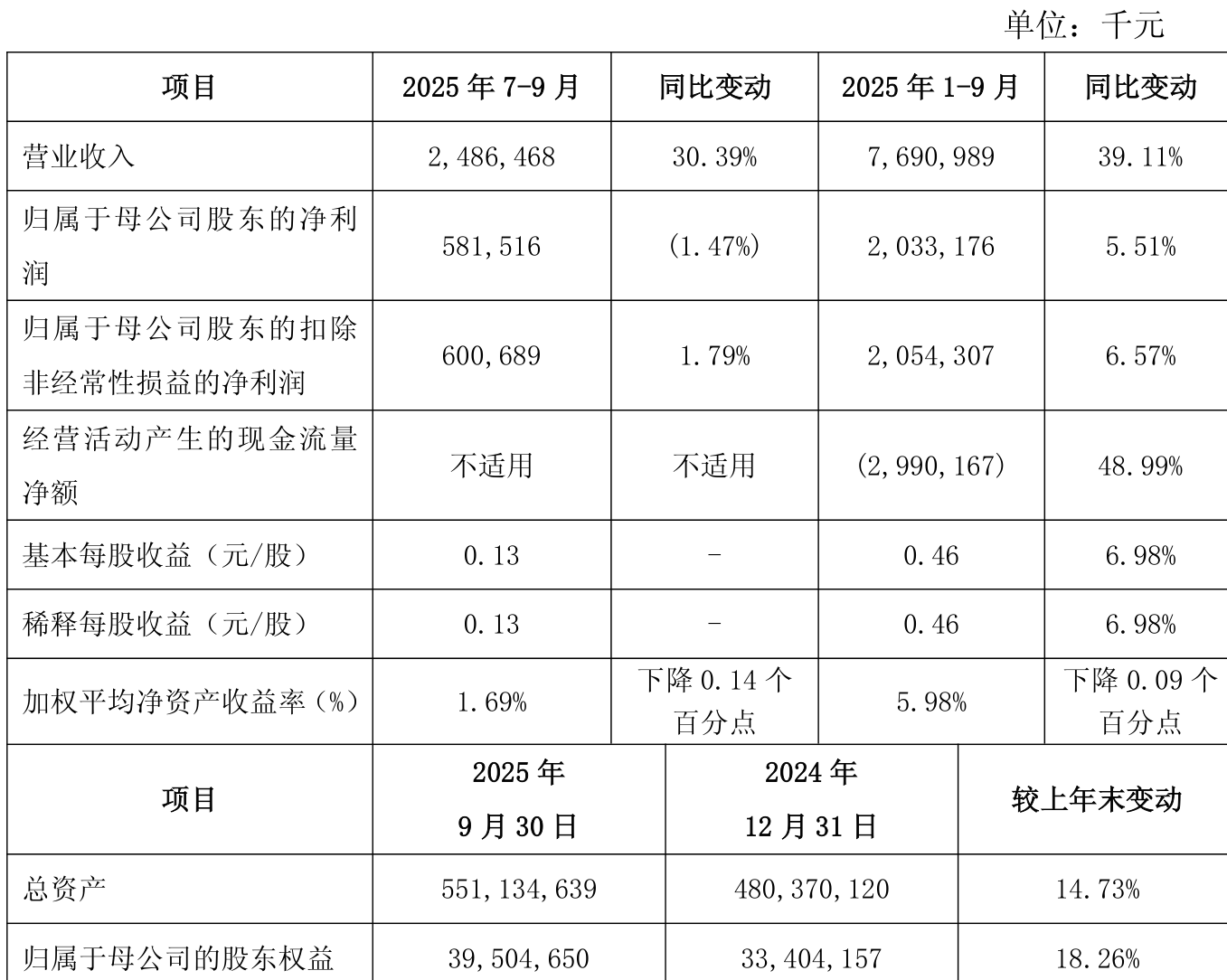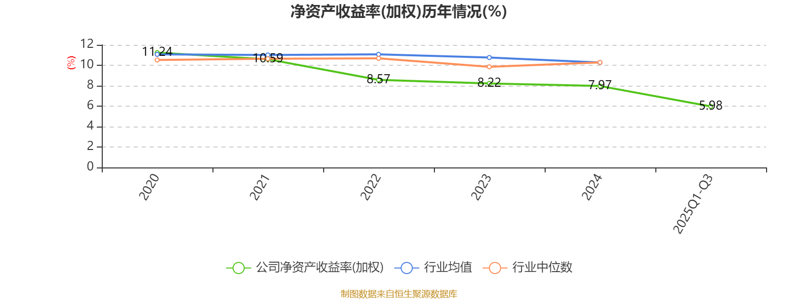盈利能力方面, 2025年前三季度公司加权平均净资产收益率为5.98%,同比下降0.09个百分点。
