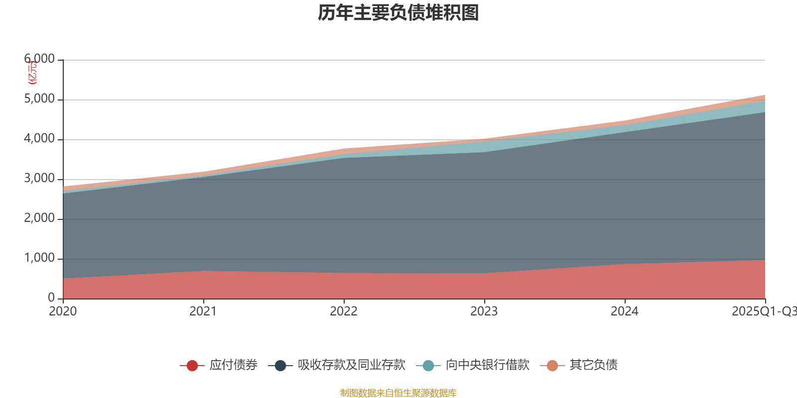 负债重大变化方面,截至2025年三季度末,公司吸收存款及同业存款较上年末增加12.3%,占公司总资产比重下降1.46个百分点;向中央银行借款较上年末增加57.62%,占公司总资产比重上升1.4个百分点;卖出回购金融资产款较上年末增加1748.9%,占公司总资产比重上升0.93个百分点;应付债券较上年末增加11.22%,占公司总资产比重下降0.55个百分点。