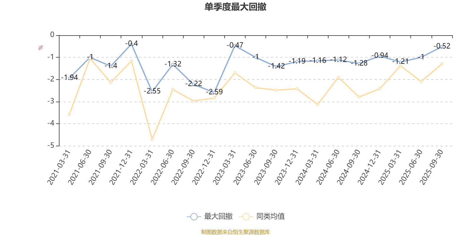 截至10月30日,基金近三年最大回撤为2.28%,同类可比基金排名20/535。单季度最大回撤出现在2022年四季度,为2.59%。