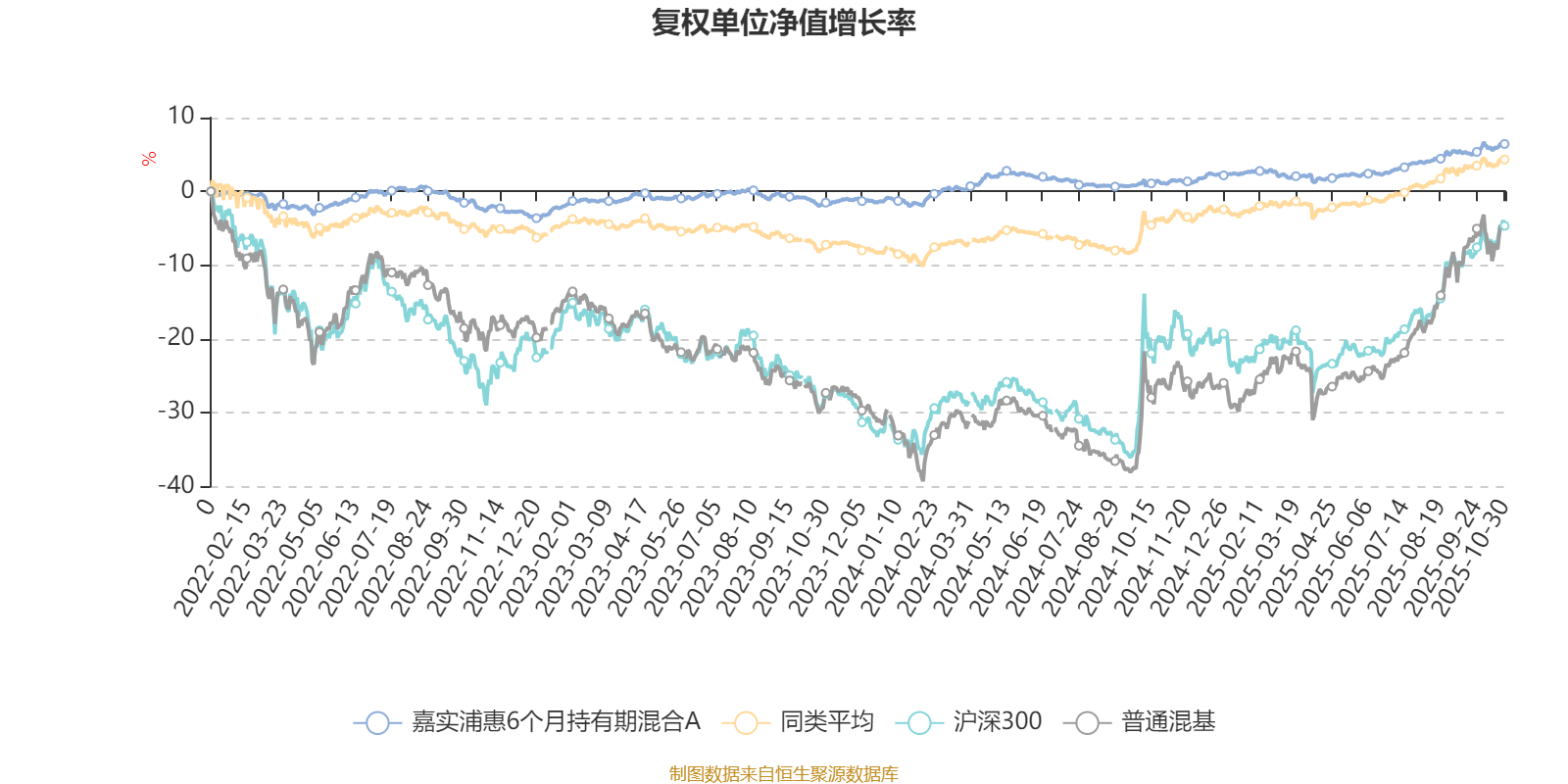 截至10月30日,嘉实浦惠6个月持有期混合A近三个月复权单位净值增长率为2.30%,位于同类可比基金334/629;近半年复权单位净值增长率为4.43%,位于同类可比基金379/629;近一年复权单位净值增长率为5.34%,位于同类可比基金457/623;近三年复权单位净值增长率为9.34%,位于同类可比基金380/557。