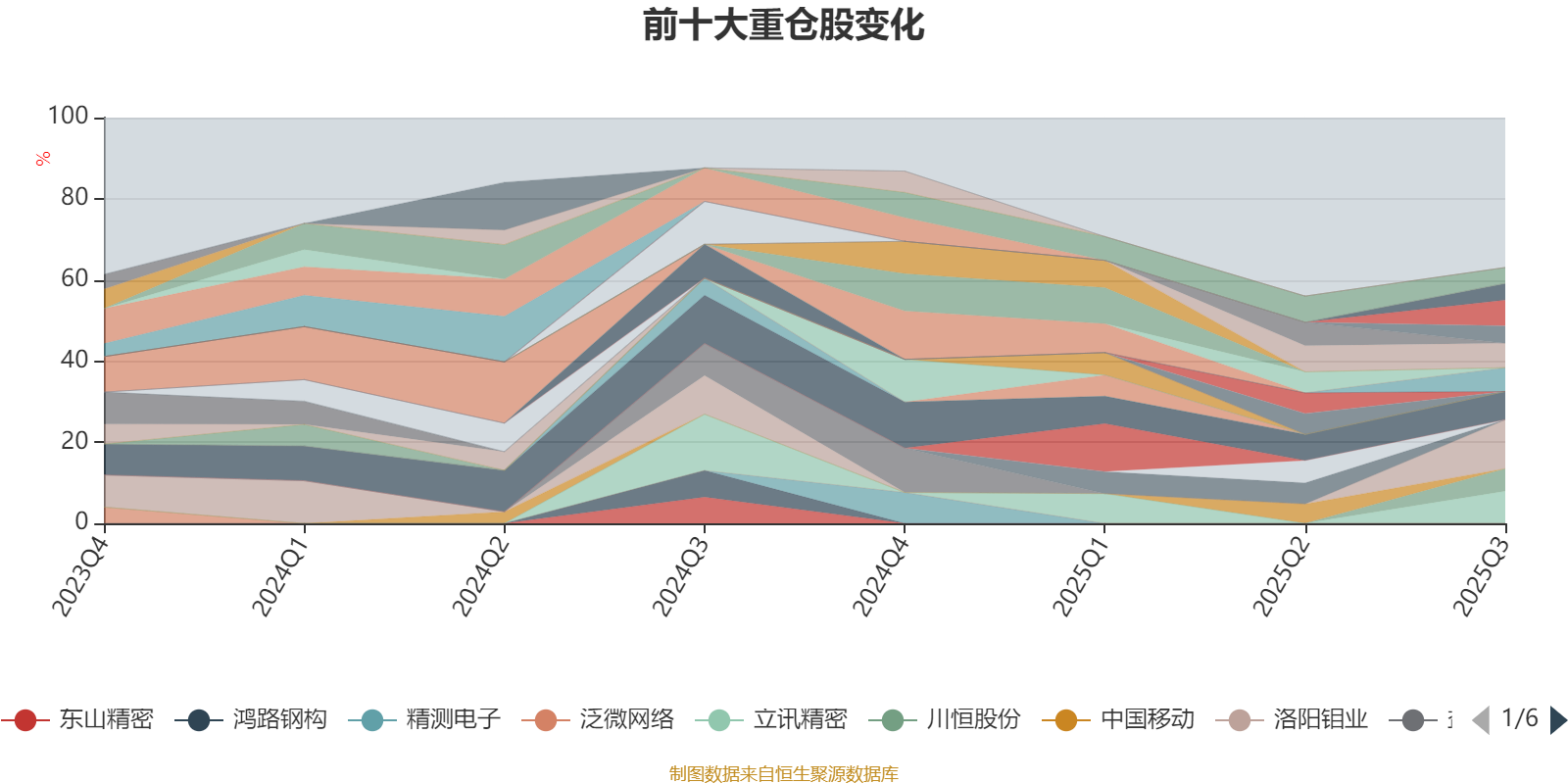 该基金持股集中度较高。截至2025年三季度末,基金十大重仓股分别是洛阳钼业、立讯精密、紫金矿业、滨江集团、恒瑞医药、奥浦迈、川恒股份、银轮股份、中天科技、中国电信。