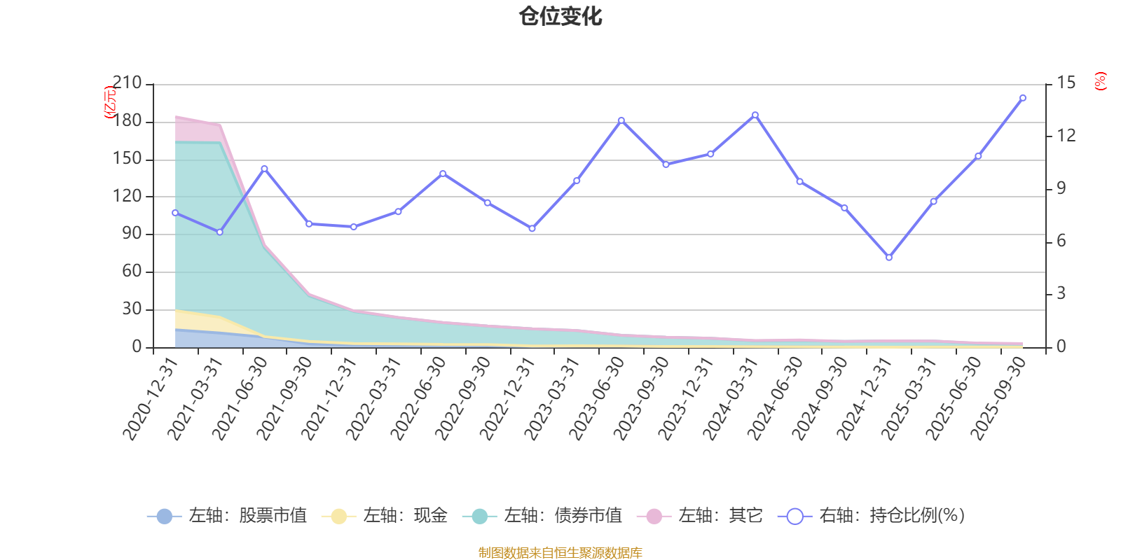据定期报告数据统计,近三年平均股票仓位为9.99%,同类平均为19.14%。2025年三季度末基金达到14.21%的最高仓位,2024年末最低,为5.13%。