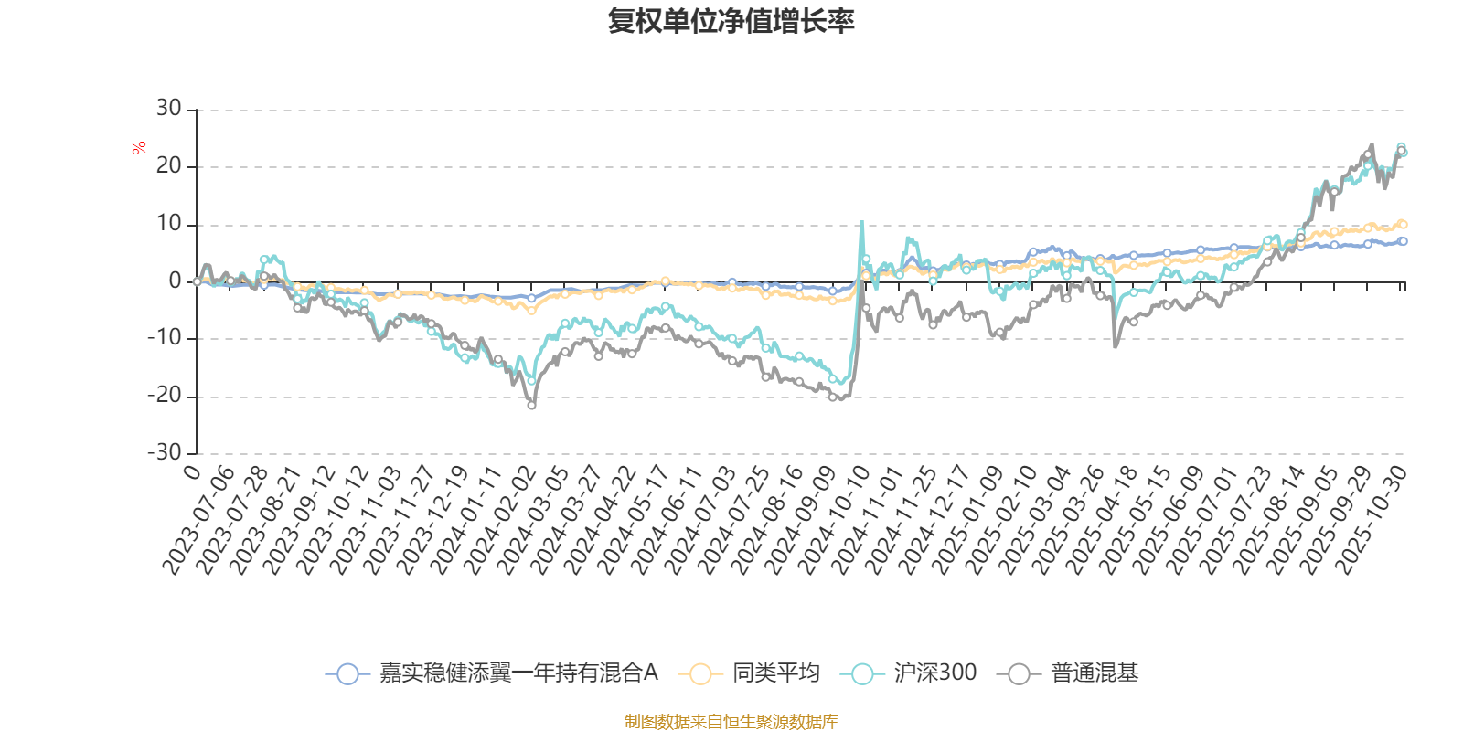 截至10月30日,嘉实稳健添翼一年持有混合A近三个月复权单位净值增长率为1.06%,位于同类可比基金495/629;近半年复权单位净值增长率为2.31%,位于同类可比基金552/629;近一年复权单位净值增长率为5.32%,位于同类可比基金461/623。