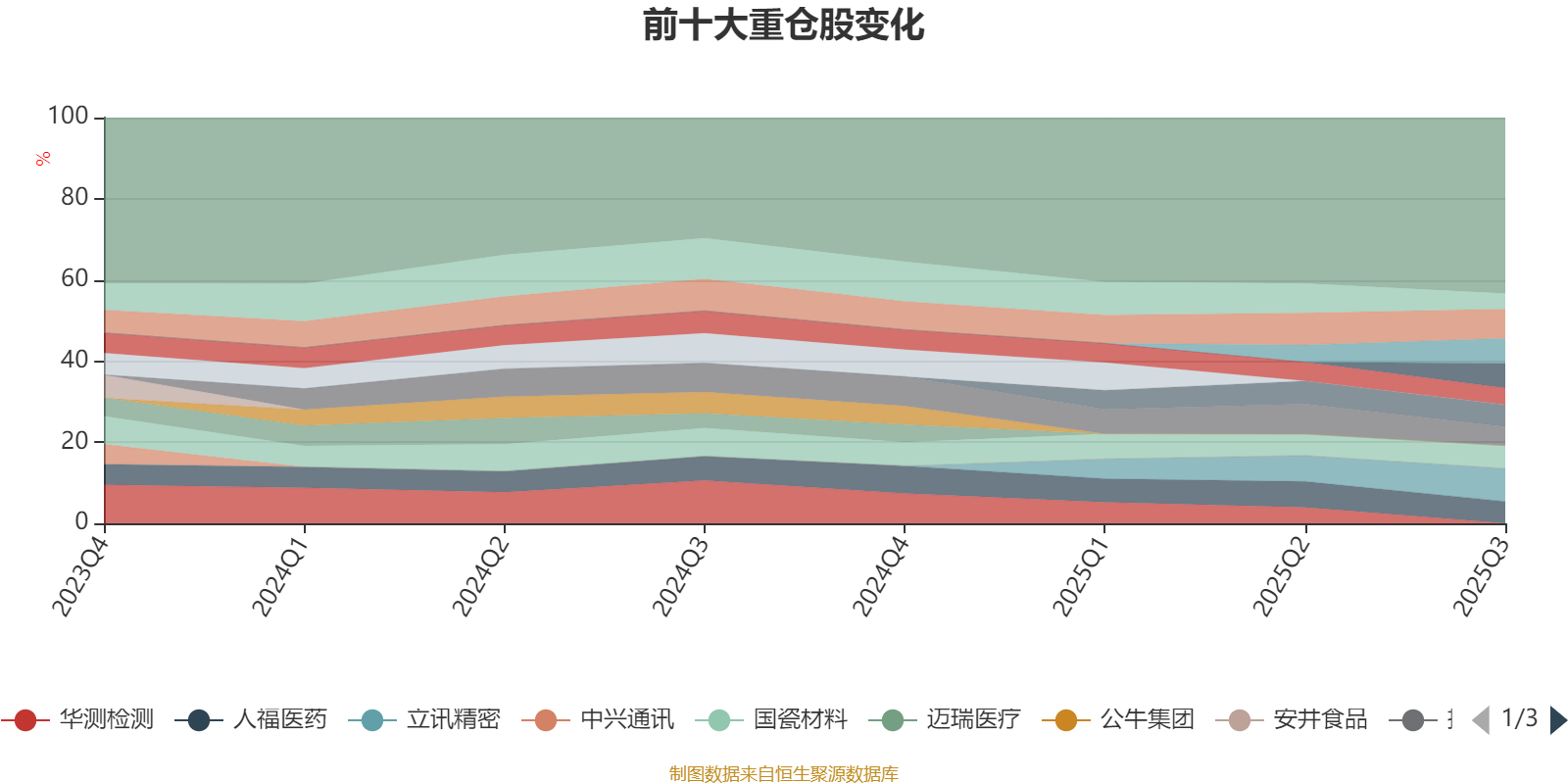 该基金持股集中度较高。截至2025年三季度末,基金十大重仓股分别是立讯精密、惠泰医疗、杰瑞股份、中微公司、国瓷材料、人福医药、广联达、招商银行、汇川技术、东阿阿胶。