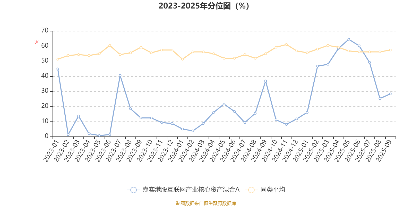 通过所选区间该基金净值增长率分位图,可以观察该基金与同类基金业绩比较情况。图为坐标原点到区间内某时点的净值增长率在同类基金中的分位数。