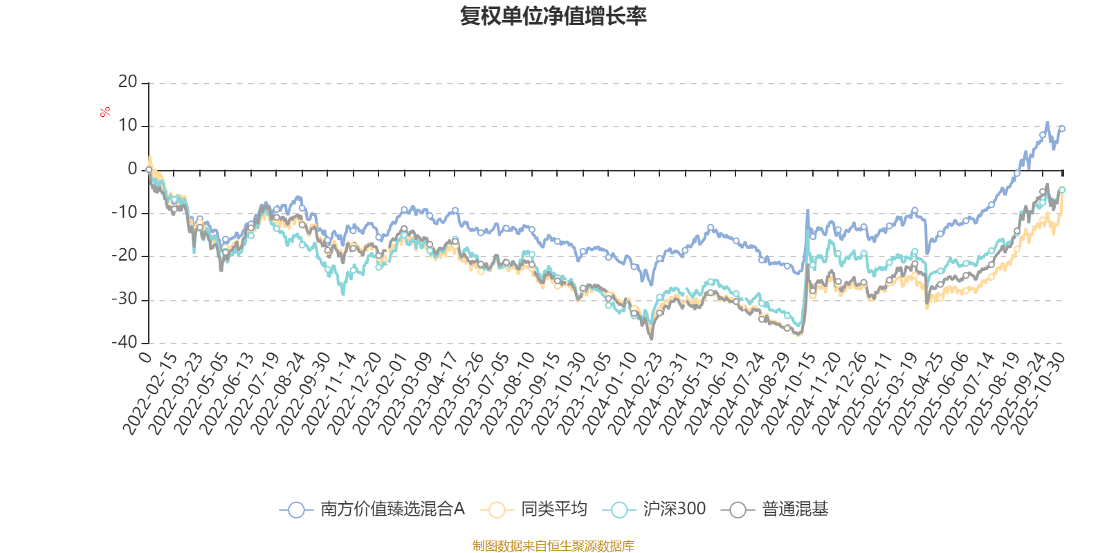 截至10月30日,南方价值臻选混合A近三个月复权单位净值增长率为14.48%,位于同类可比基金48/134;近半年复权单位净值增长率为28.38%,位于同类可比基金51/134;近一年复权单位净值增长率为28.33%,位于同类可比基金41/130;近三年复权单位净值增长率为32.53%,位于同类可比基金32/119。
