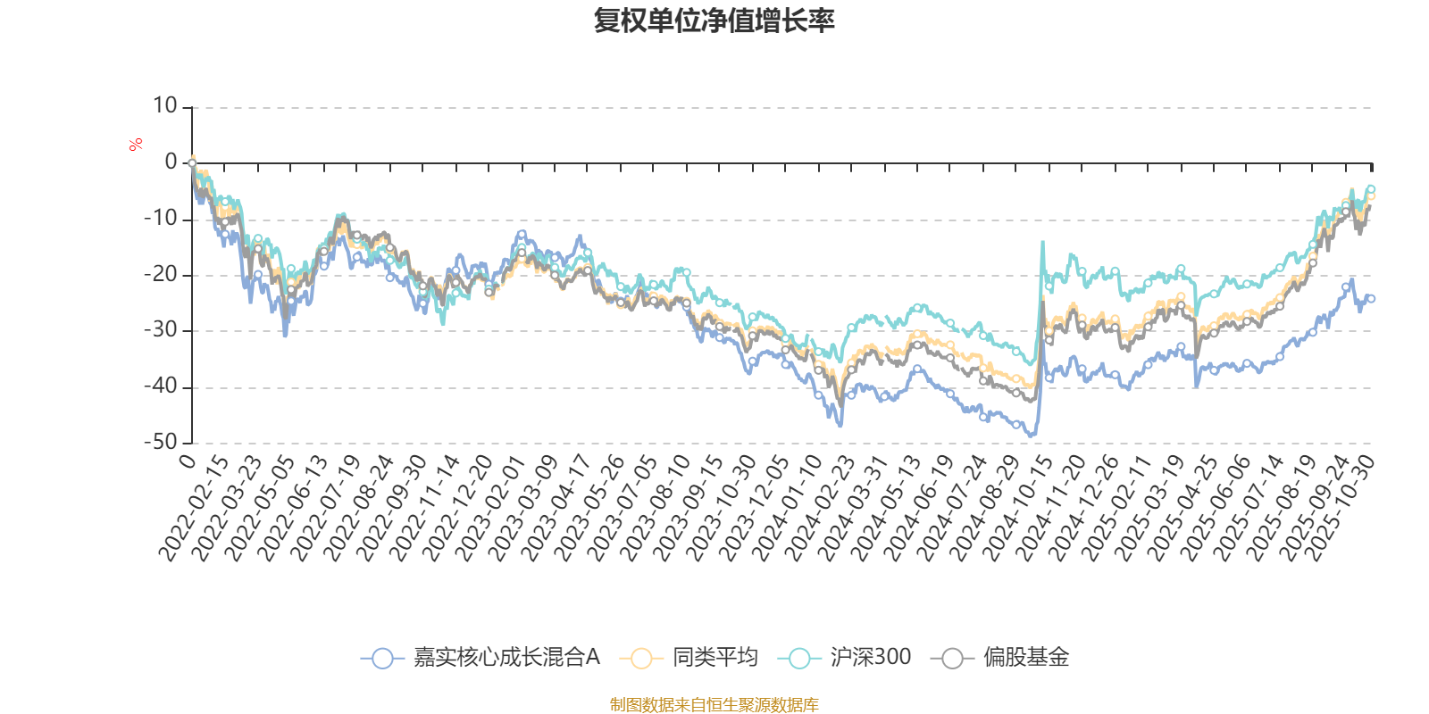 截至10月30日,嘉实核心成长混合A近三个月复权单位净值增长率为11.01%,位于同类可比基金88/130;近半年复权单位净值增长率为20.76%,位于同类可比基金91/130;近一年复权单位净值增长率为21.53%,位于同类可比基金84/130;近三年复权单位净值增长率为0.17%,位于同类可比基金106/124。