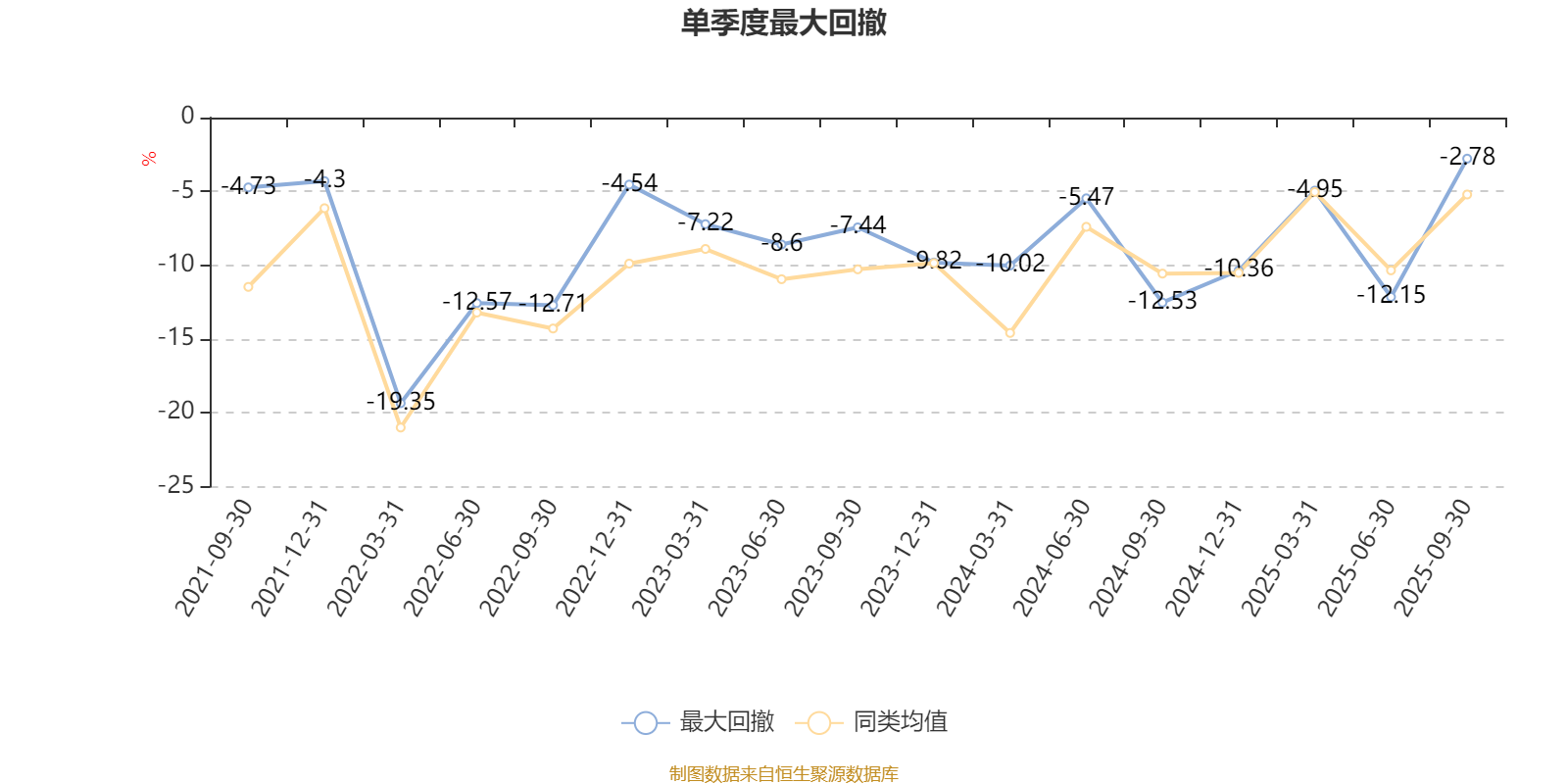 截至10月29日,基金近三年最大回撤为20.96%,同类可比基金排名9/124。单季度最大回撤出现在2022年一季度,为19.35%。