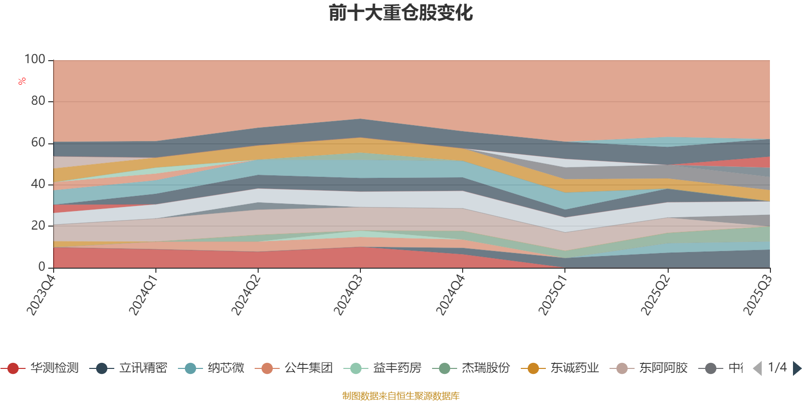 该基金持股集中度较高,近2年前十大重仓股集中度长期超过60%。截至2025年三季度末,基金十大重仓股分别是立讯精密、惠泰医疗、杰瑞股份、人福医药、广联达、中微公司、国瓷材料、水晶光电、思特威、纳芯微。