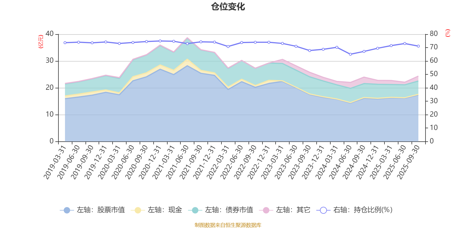 据定期报告数据统计,近三年平均股票仓位为70.19%,同类平均为72.35%。2020年末基金达到74.97%的最高仓位,2024年上半年末最低,为65.06%。