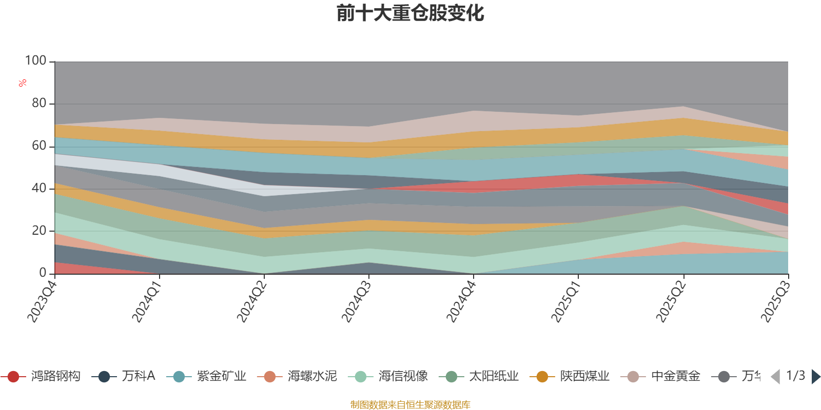 该基金持股集中度较高,近2年前十大重仓股集中度长期超过60%。截至2025年三季度末,基金十大重仓股分别是紫金矿业、成都银行、亿联网络、纽威股份、海信视像、滨江集团、中金黄金、招商银行、华鲁恒升、南钢股份。