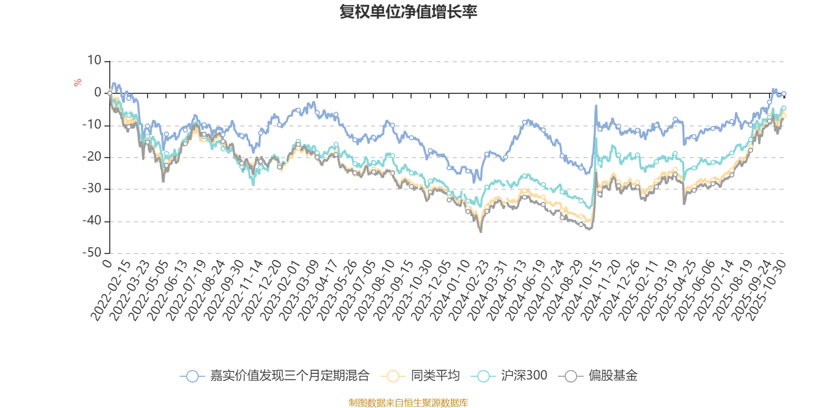 截至10月30日,嘉实价值发现三个月定期混合近三个月复权单位净值增长率为9.96%,位于同类可比基金92/130;近半年复权单位净值增长率为17.52%,位于同类可比基金100/130;近一年复权单位净值增长率为12.09%,位于同类可比基金116/130;近三年复权单位净值增长率为21.38%,位于同类可比基金71/124。