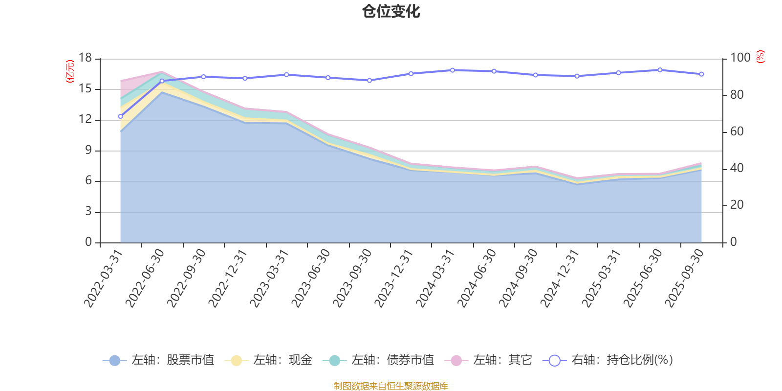 据定期报告数据统计,近三年平均股票仓位为91.39%,同类平均为85.99%。2025年上半年末基金达到93.89%的最高仓位,2022年一季度末最低,为68.63%。