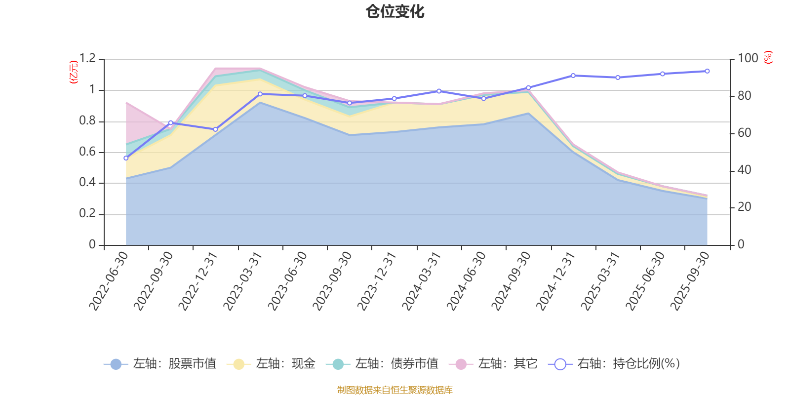 据定期报告数据统计,近三年平均股票仓位为82.75%,同类平均为83.73%。2025年三季度末基金达到93.64%的最高仓位,2022年上半年末最低,为46.83%。