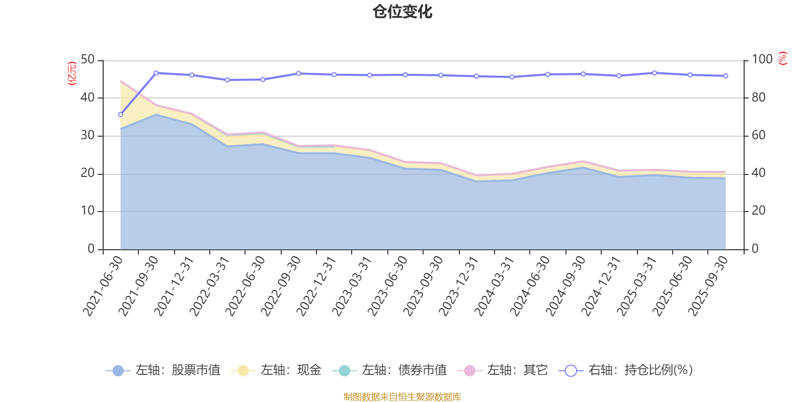 据定期报告数据统计,近三年平均股票仓位为92.2%,同类平均为86.57%。2025年一季度末基金达到93.33%的最高仓位,2021年上半年末最低,为71.35%。