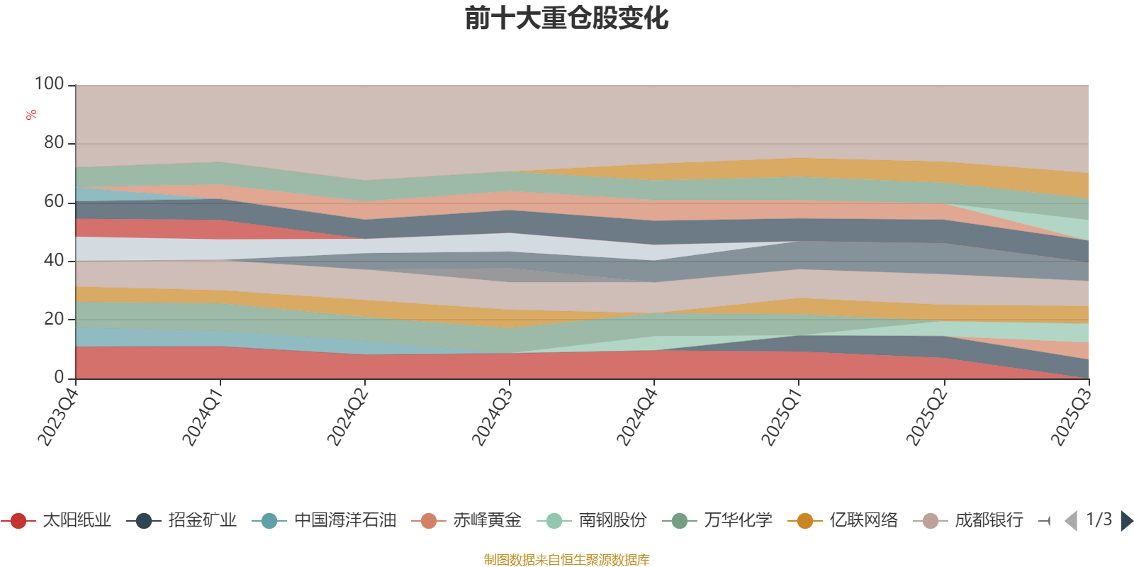 该基金持股集中度较高,近2年前十大重仓股集中度长期超过60%。截至2025年三季度末,基金十大重仓股分别是海丰国际、成都银行、海信视像、纽威股份、紫金矿业、招金矿业、南钢股份、招商银行、亿联网络、赤峰黄金。