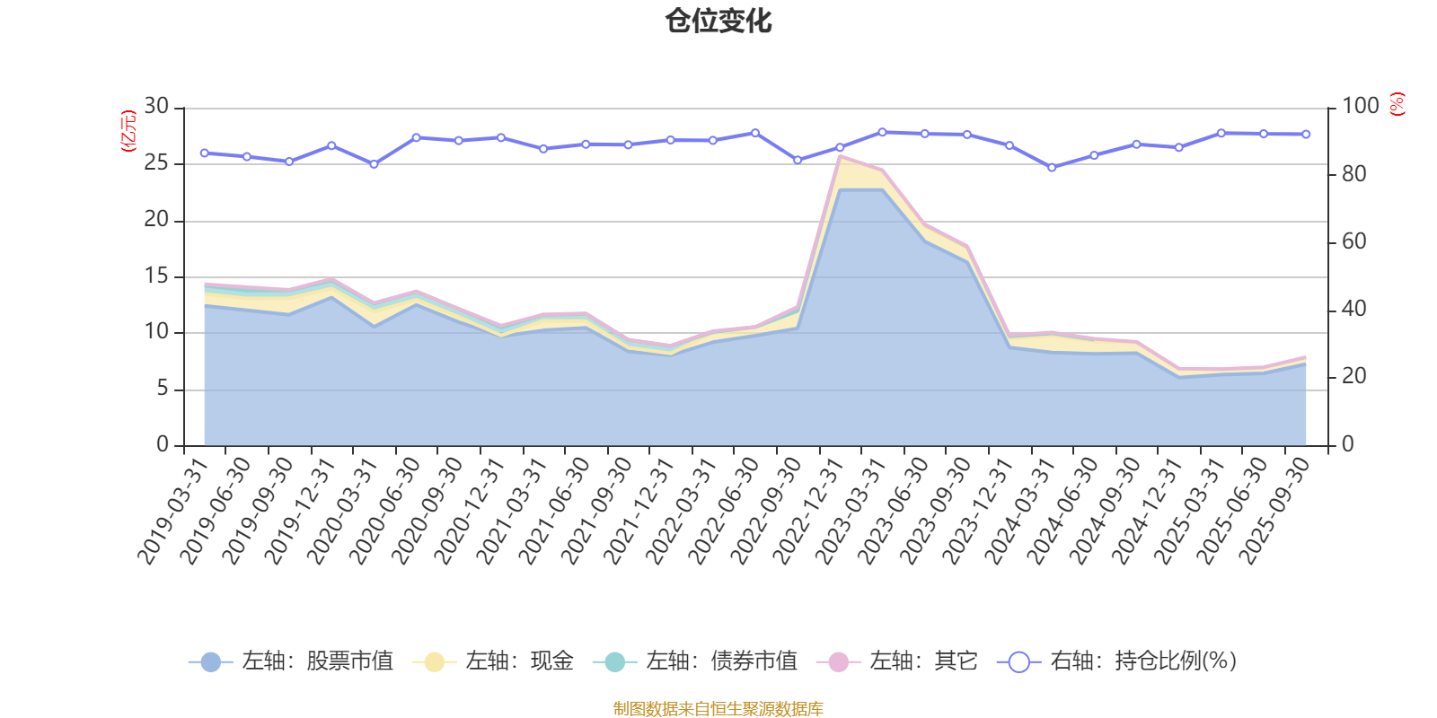 据定期报告数据统计,近三年平均股票仓位为89.73%,同类平均为85.99%。2023年一季度末基金达到92.78%的最高仓位,2024年一季度末最低,为82.31%。