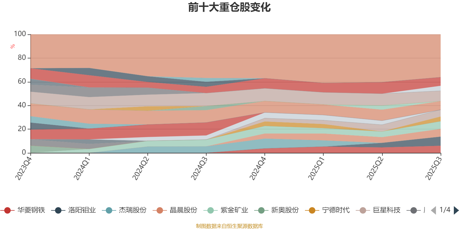 该基金持股集中度较高。截至2025年三季度末,基金十大重仓股分别是吉祥航空、洛阳钼业、圆通速递、江苏银行、晶晨股份、紫金矿业、华菱钢铁、巨星科技、华友钴业、宁德时代。