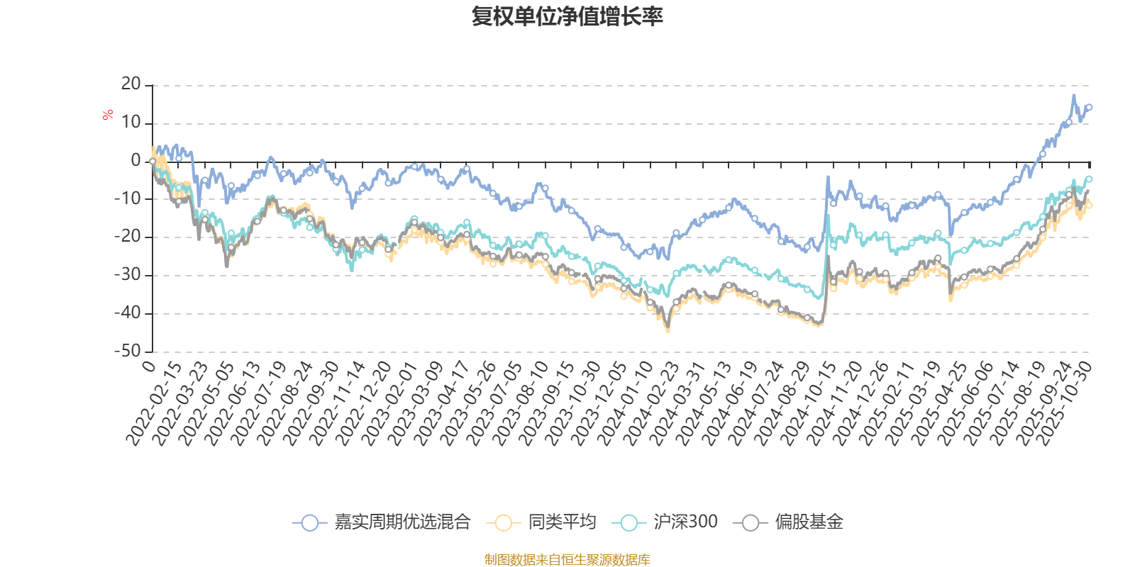 截至10月30日,嘉实周期优选混合近三个月复权单位净值增长率为16.16%,位于同类可比基金116/265;近半年复权单位净值增长率为32.66%,位于同类可比基金107/265;近一年复权单位净值增长率为25.72%,位于同类可比基金161/265;近三年复权单位净值增长率为27.70%,位于同类可比基金99/253。