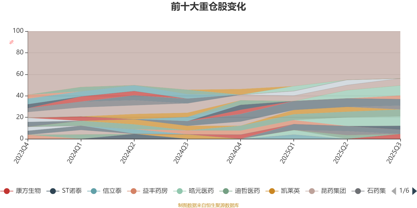 截至2025年三季度末,基金十大重仓股分别是信达生物、三生制药、百济神州、恒瑞医药、药明康德、康方生物、泽璟制药、奥浦迈、诺诚健华、迈威生物。