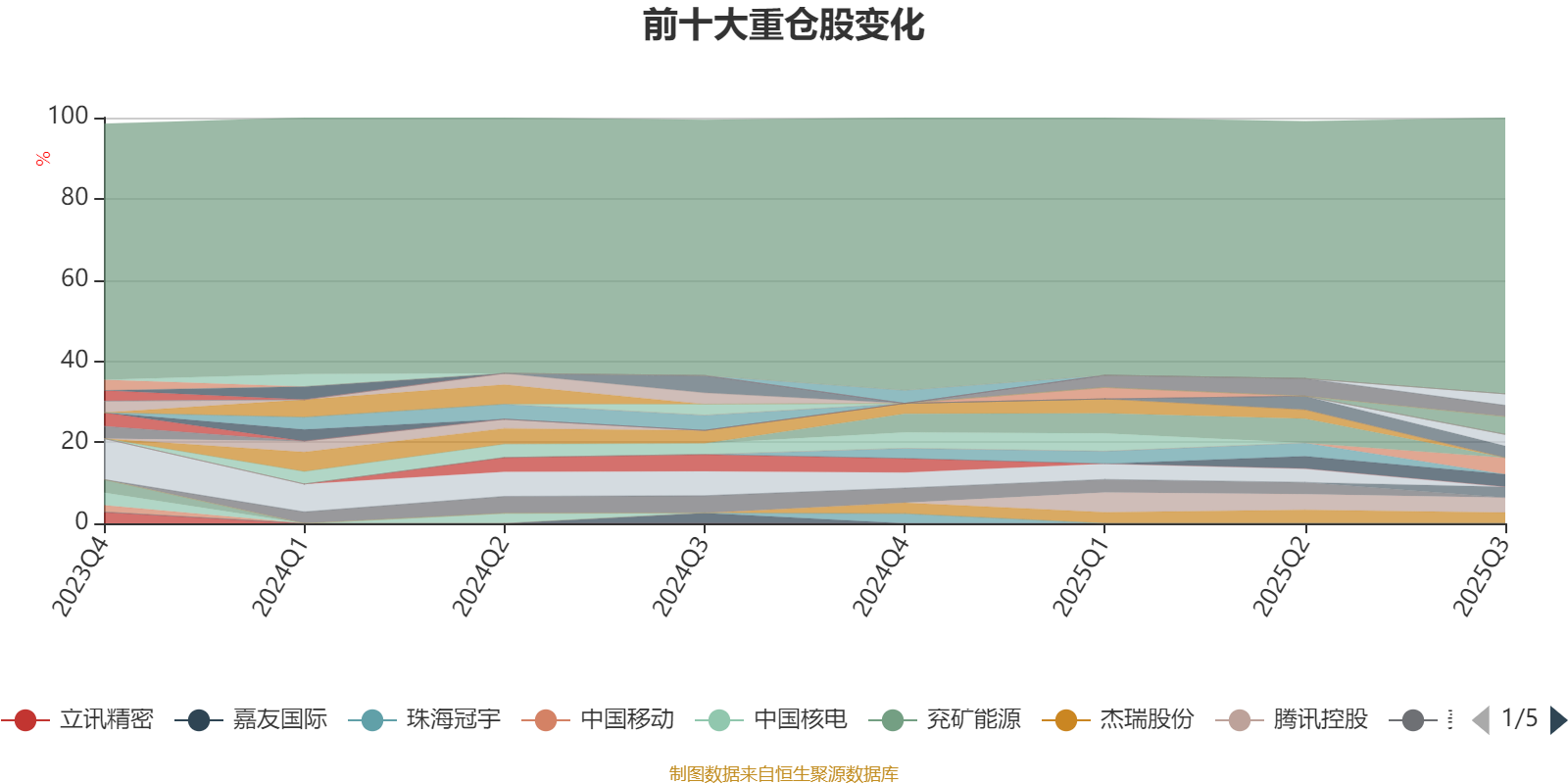 截至2025年三季度末,基金十大重仓股分别是中芯国际、生益科技、腾讯控股、宁德时代、药明康德、寒武纪、拓荆科技、阿里巴巴-W、杰瑞股份、ST华通。