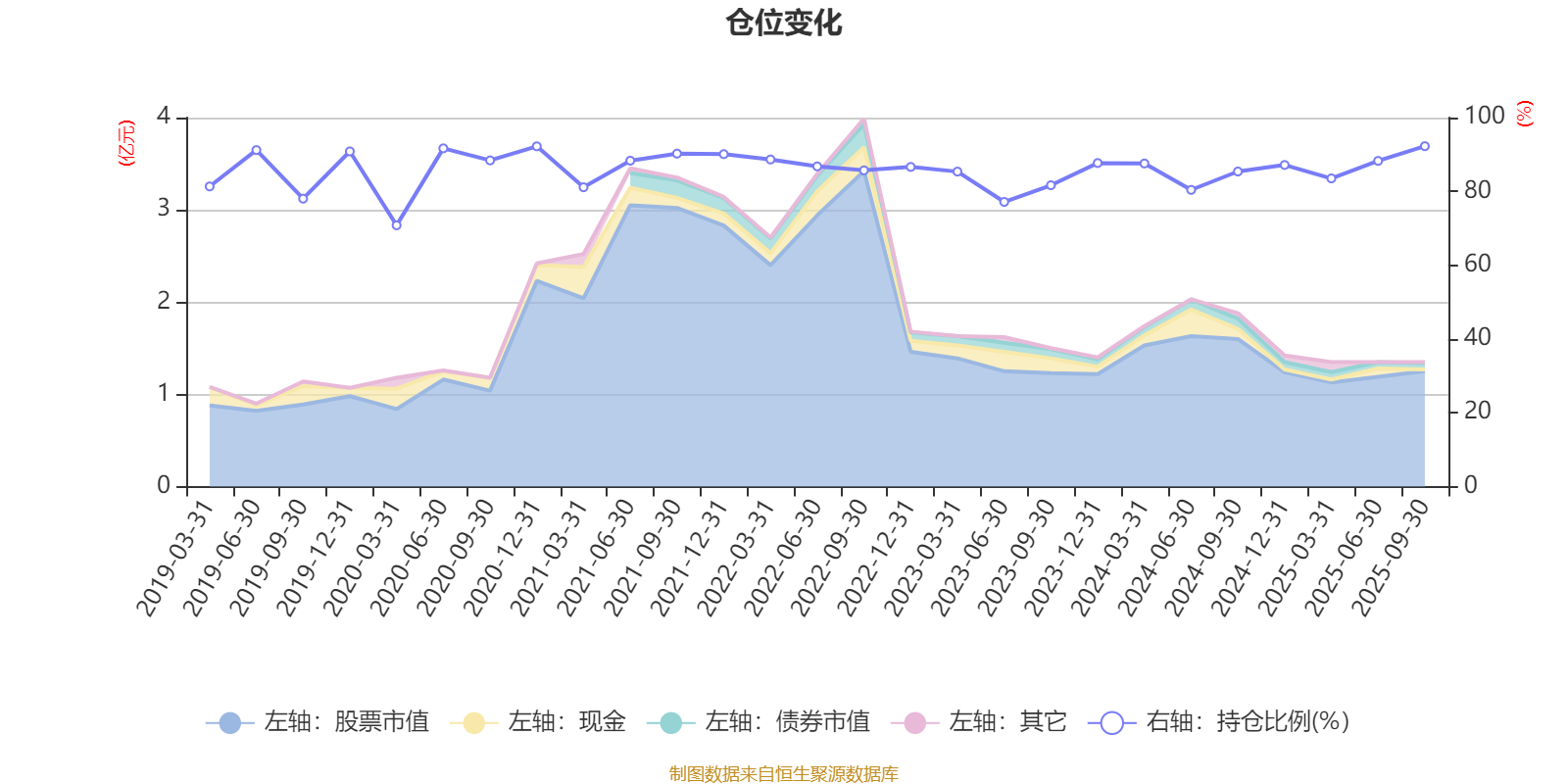 据定期报告数据统计,近三年平均股票仓位为85.25%,同类平均为86.57%。2025年三季度末基金达到92.25%的最高仓位,2020年一季度末最低,为70.81%。