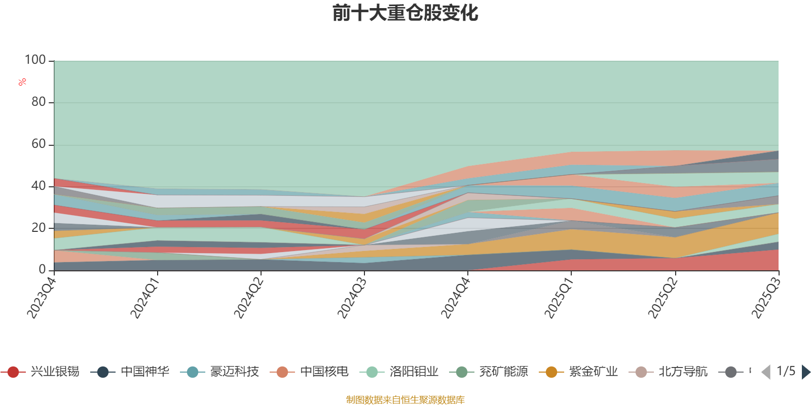 截至2025年三季度末,基金十大重仓股分别是紫金矿业、兴业银锡、山金国际、金诚信、华阳股份、华友钴业、中国海油、天山铝业、洛阳钼业、中国神华。