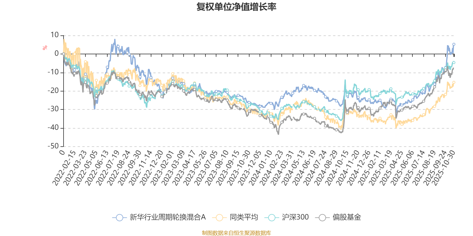 截至10月30日,新华行业周期轮换混合A近三个月复权单位净值增长率为28.20%,位于同类可比基金15/49;近半年复权单位净值增长率为45.24%,位于同类可比基金15/49;近一年复权单位净值增长率为36.06%,位于同类可比基金21/42;近三年复权单位净值增长率为25.81%,位于同类可比基金19/29。