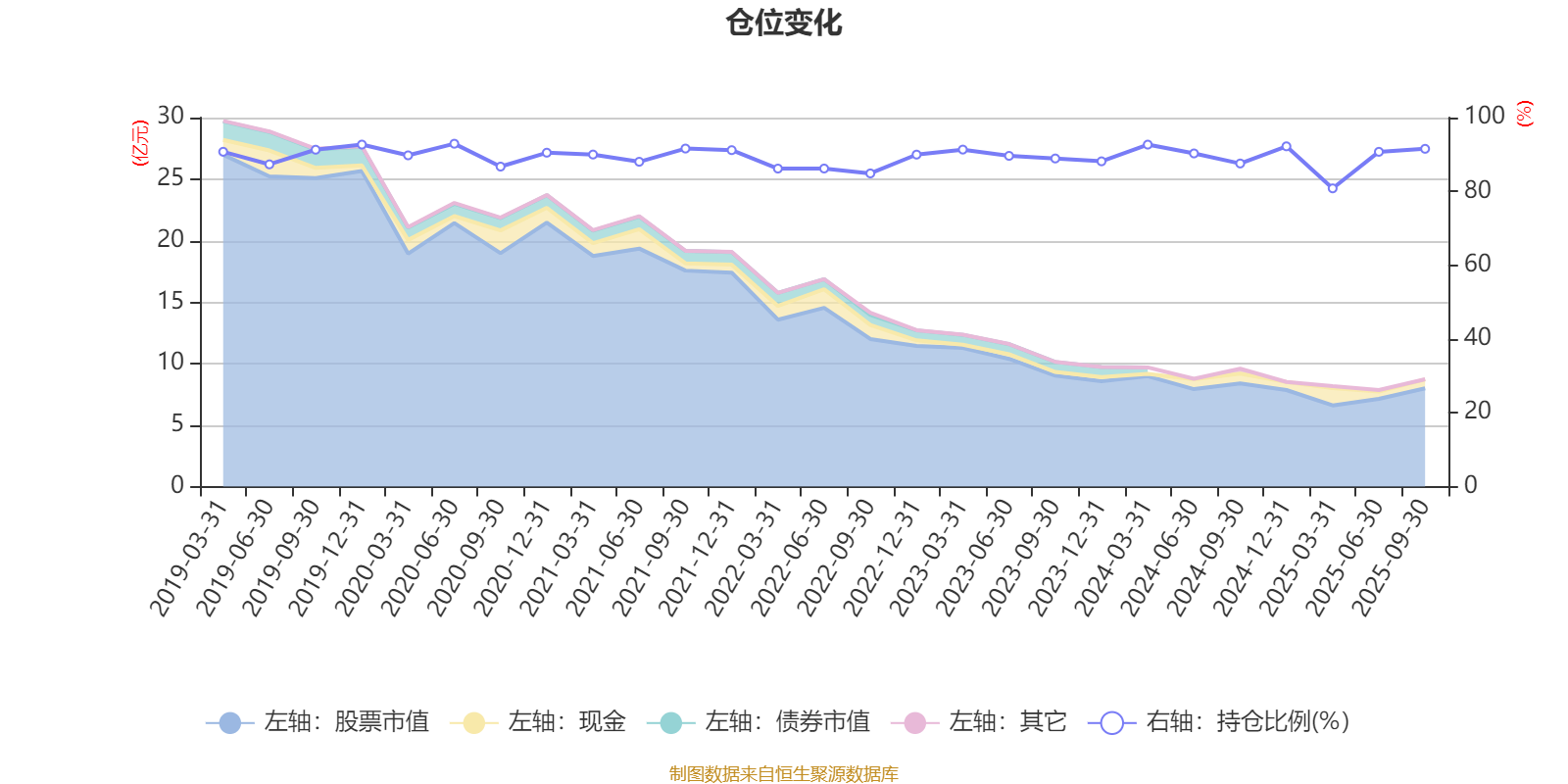 据定期报告数据统计,近三年平均股票仓位为89.49%,同类平均为85.99%。2020年上半年末基金达到92.92%的最高仓位,2025年一季度末最低,为80.82%。