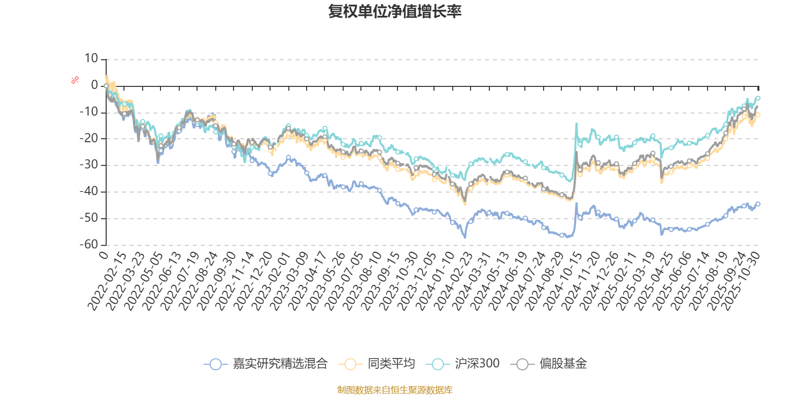 截至10月30日,嘉实研究精选混合近三个月复权单位净值增长率为11.19%,位于同类可比基金172/265;近半年复权单位净值增长率为21.42%,位于同类可比基金195/265;近一年复权单位净值增长率为6.96%,位于同类可比基金260/265;近三年复权单位净值增长率为-24.90%,位于同类可比基金248/253。