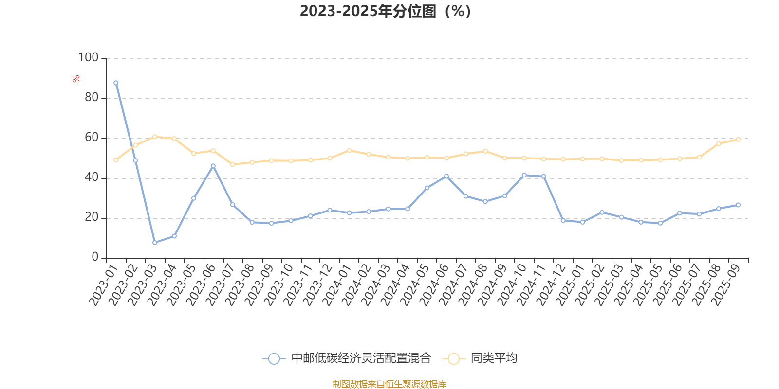 通过所选区间该基金净值增长率分位图,可以观察该基金与同类基金业绩比较情况。图为坐标原点到区间内某时点的净值增长率在同类基金中的分位数。
