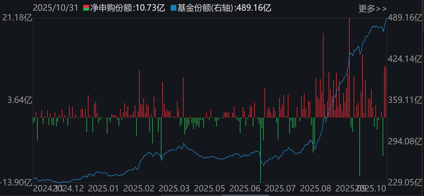在跨境ETF方面,10月净流入资金超30亿元的基金有3只,其中恒生科技指数ETF、恒生科技ETF和恒生科技ETF天弘分别增加了48.51亿份、40.36亿份和31.9亿份,净流入资金39.54亿元、32.21亿元和30.67亿元。