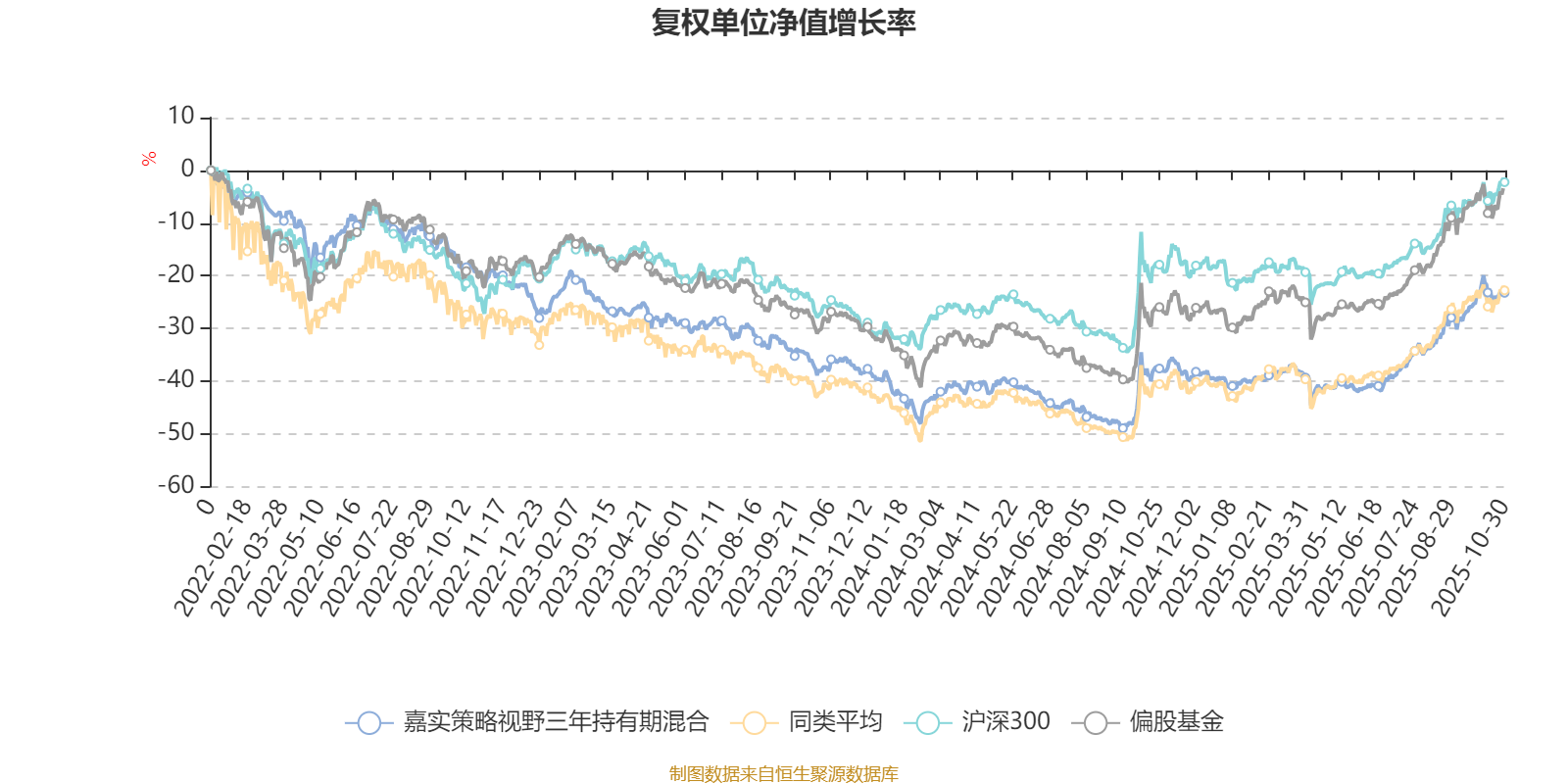 截至10月30日,嘉实策略视野三年持有期混合近三个月复权单位净值增长率为15.96%,位于同类可比基金270/621;近半年复权单位净值增长率为30.96%,位于同类可比基金279/621;近一年复权单位净值增长率为23.86%,位于同类可比基金378/611;近三年复权单位净值增长率为-2.15%,位于同类可比基金441/518。