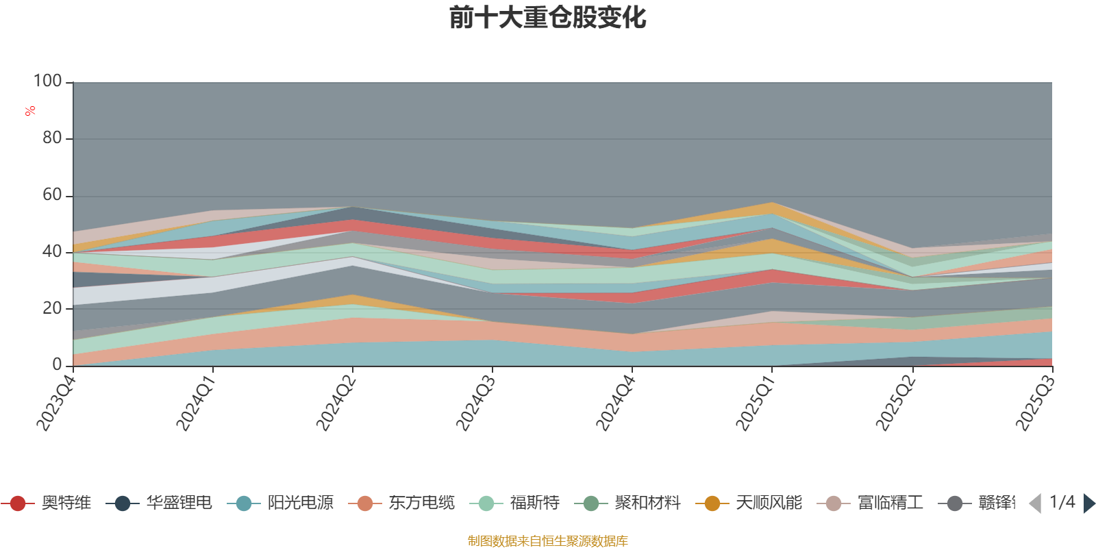 截至2025年三季度末,基金十大重仓股分别是宁德时代、阳光电源、先导智能、东方电缆、聚和材料、大全能源、亿纬锂能、华友钴业、奥特维、中矿资源。