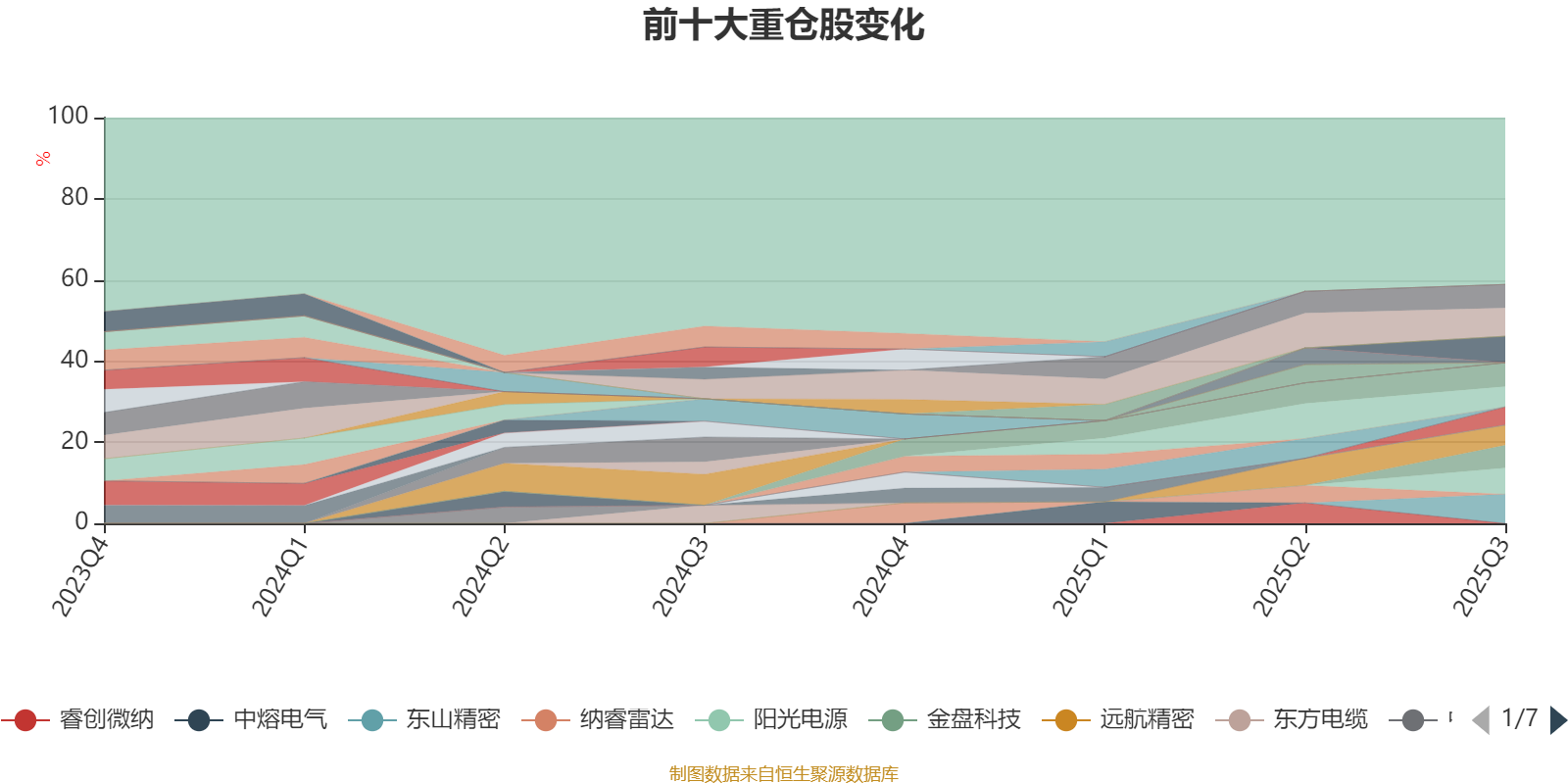 截至2025年三季度末,基金十大重仓股分别是东山精密、华测导航、亿纬锂能、阳光电源、麦加芯彩、博迁新材、金盘科技、大金重工、远航精密、焦点科技。