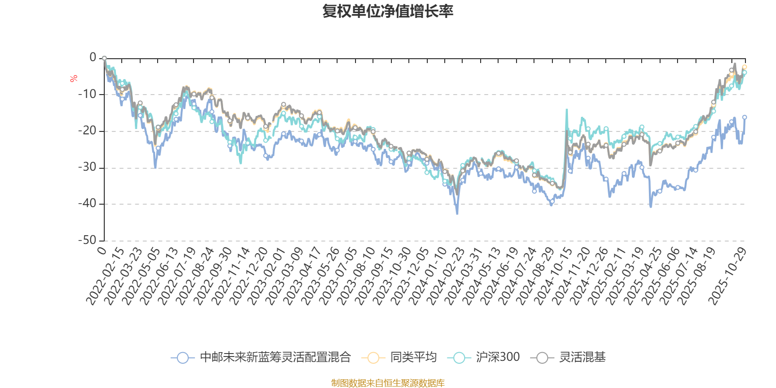 截至10月29日,中邮未来新蓝筹灵活配置混合近三个月复权单位净值增长率为13.56%,位于同类可比基金586/1287;近半年复权单位净值增长率为31.26%,位于同类可比基金478/1287;近一年复权单位净值增长率为14.49%,位于同类可比基金859/1287;近三年复权单位净值增长率为12.27%,位于同类可比基金764/1286。