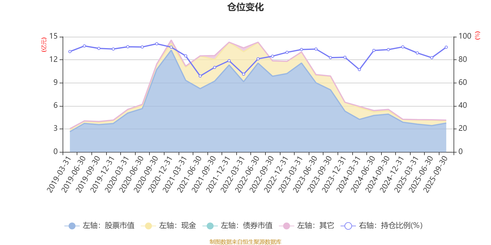 据定期报告数据统计,近三年平均股票仓位为85.61%,同类平均为72.35%。2020年三季度末基金达到93.88%的最高仓位,2021年上半年末最低,为65.94%。
