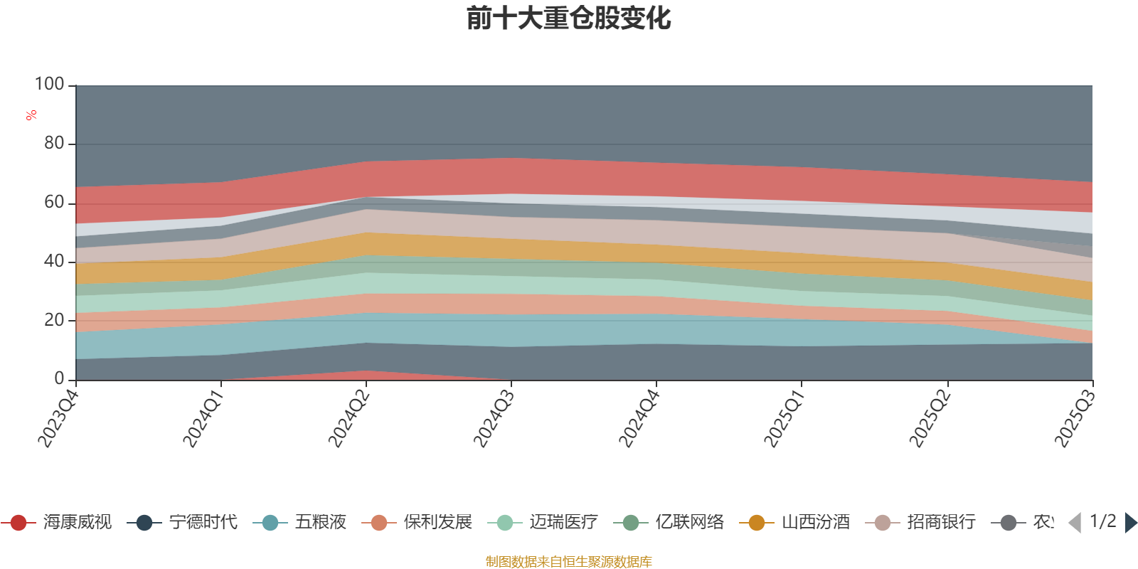 该基金持股集中度较高,且持股标的较为稳定,近2年前十大重仓股集中度长期超过60%。截至2025年三季度末,基金十大重仓股分别是宁德时代、贵州茅台、招商银行、药明康德、山西汾酒、亿联网络、迈瑞医疗、星宇股份、保利发展、农业银行。