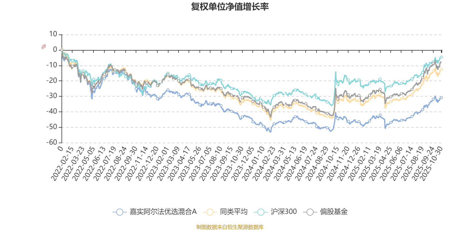 截至10月30日,嘉实阿尔法优选混合A近三个月复权单位净值增长率为15.89%,位于同类可比基金76/185;近半年复权单位净值增长率为30.07%,位于同类可比基金87/185;近一年复权单位净值增长率为25.39%,位于同类可比基金107/181;近三年复权单位净值增长率为-2.60%,位于同类可比基金153/175。