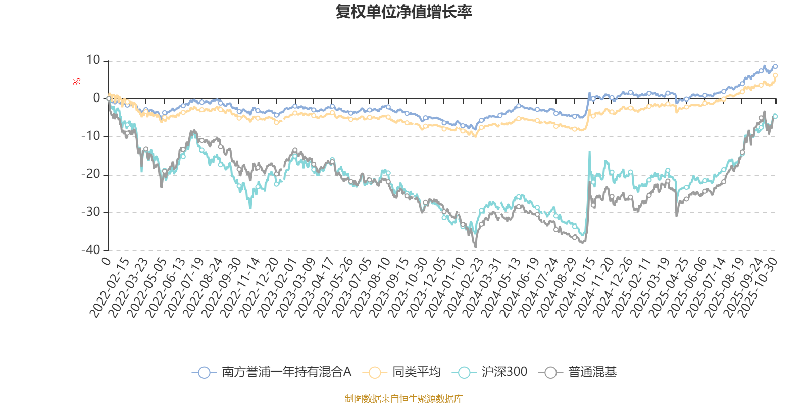 截至10月30日,南方誉浦一年持有混合A近三个月复权单位净值增长率为5.54%,位于同类可比基金96/629;近半年复权单位净值增长率为8.73%,位于同类可比基金142/629;近一年复权单位净值增长率为8.65%,位于同类可比基金231/623;近三年复权单位净值增长率为13.19%,位于同类可比基金242/557。