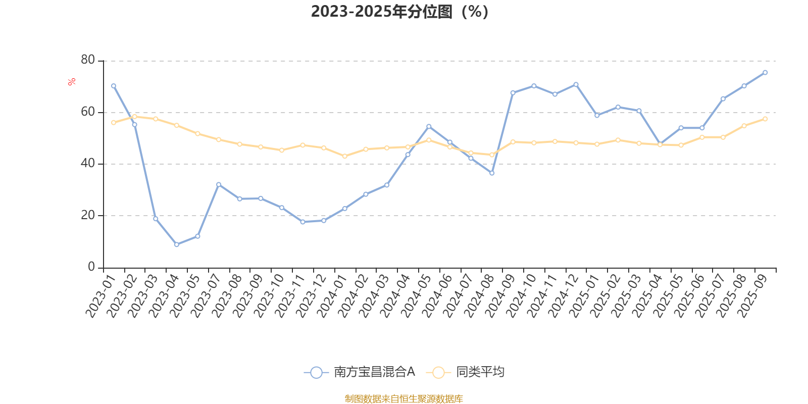 通过所选区间该基金净值增长率分位图,可以观察该基金与同类基金业绩比较情况。图为坐标原点到区间内某时点的净值增长率在同类基金中的分位数。