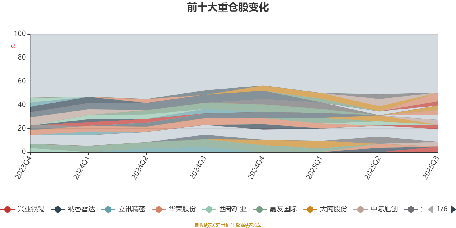 截至2025年三季度末,基金十大重仓股分别是紫金矿业、工业富联、兴业银锡、铜陵有色、中际旭创、万华化学、恺英网络、国恩股份、圆通速递、浙江荣泰。